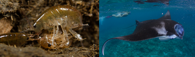 We set out to explore in simulations how a fast life-history species, the beach hopper Orchestia gammarellus (Fig. 2, left), and a slow life-history species, the reef manta ray Mobula alfredi (previously Manta alfredi) (Fig. 2, right), respond to changes in food conditions [2]. We found that the beach hopper responds strongly to how often food conditions are favourable, whereas the manta ray responds strongly to how predictable food conditions are. These results are opposite to those found in big-data analyses based on phenomenological descriptions of life histories [1].